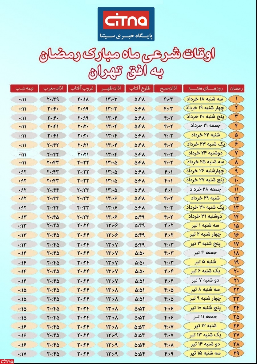 جدول اوقات شرعی تهران در ماه مبارک رمضان