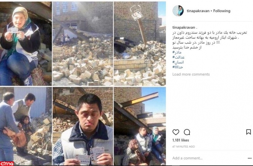 به گزارش سرویس وبگردی سیتنا، تینا پاکروان در اینستاگرام نوشت: تخریب خانه یک مادر با دو فرزند سندرم داون در شهرک ایثار ارومیه به بهانه ساخت غیرمجاز، در روز مادر، در شب سال نو!