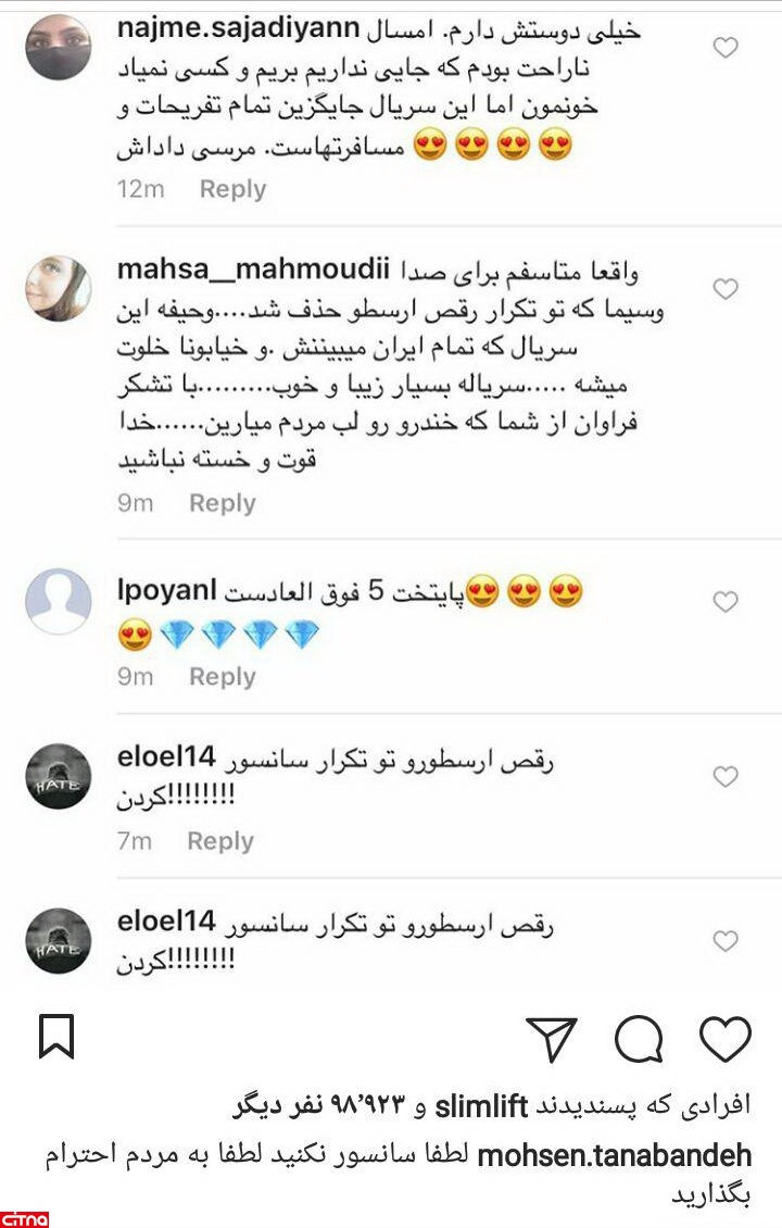 نویسنده این مجموعه تلویزیونی و بازیگر نقش «نقی» با انتشار تصویری از واکنش برخی از کاربران اینستاگرم نسبت به حذف بخش پایکوبی «ارسوط» نوشت: «لطفا سانسور نکنید. لطفا به مردم احترام بگذارید.»