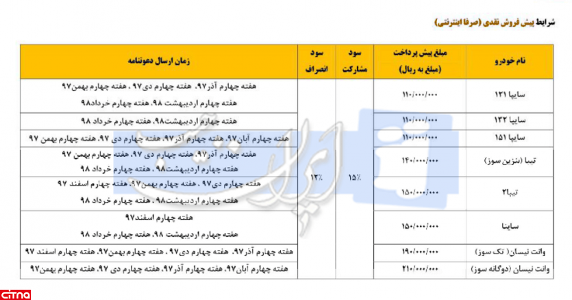 آغاز پیش فروش اینترنتی محصولات سایپا از 10 صبح چهارشنبه 14 شهریور 97 (+جدول)
