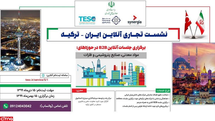 طی نشست رودررو بین شرکتهای ایرانی و مجموعه های متناظر فناور ترکیه ای حوزه های «فناوری اطلاعات و ارتباطات»، «سلامت و تجهیزات پزشکی»، «زیست فناوری»، «الکترونیک و ماشین آلات» و غیره که در بهمن ماه سال ۹۸ برگزار شد، این بار مرکز تعاملات بین المللی علم و فناوری معاونت علمی و فناوری ریاست جمهوری اقدام به برگزاری نشست تجاری آنلاین ایران و ترکیه کرده است. این نشست در حوزه های تخصصی «مواد معدنی»، «صنایع پتروشیمی» و «فلزات» 15 بهمن ماه امسال برگزار می شود.