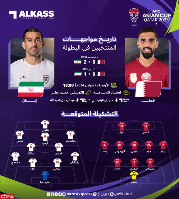 به گزارش سیتنا، تیم‌های ملی ایران و قطر دومین بازی دور نیمه‌نهایی جام ملت‌های آسیا را امشب (چهارشنبه، ۱۸ بهمن) برگزار می‌کنند تا تکلیف حریف اردن در بازی نهایی مشخص شود. روزنامه الکاس قطر ترکیب احتمالی ایران و قطر را اعلام کرد که نکته عجیب در ترکیب ایران نیمکت‌نشین‌شدن سردار آزمون است که با توجه به درخشش او در بازی با ژاپن عجیب و دور از انتظار به نظر می‌رسد.