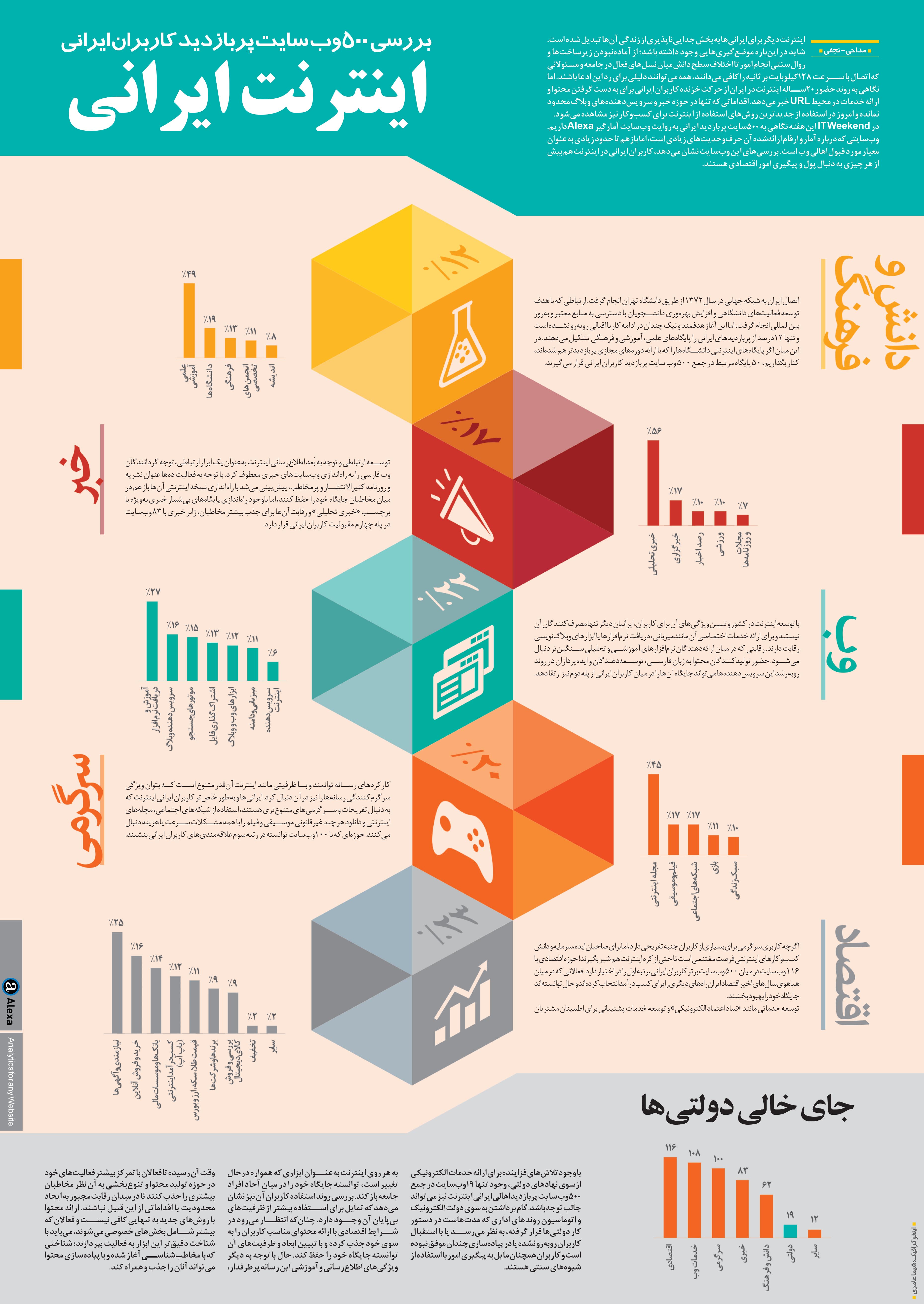 در این اینفو گرافی ۵۰۰ وب سایت پربازدید کاربران ایرانی مورد بررسی قرار گرفته و این سایت ها در ۵ دسته اقتصادی، خبری، علمی آموزشی، سرگرمی و خدمات وب دسته بندی شده اند. لازم به توضیح است که هریک از این دسته ها نیز دارای دسته بندی مخصوص به خود می باشند.