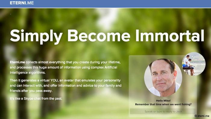 به گزارش سیتنا به نقل از دویچه وله، "به سادگی جاودانه شوید." این شعار سرویس آنلاین جدیدی است که از دل «مرکز توسعه کارآفرینی دانشگاه امآیتی» بیرون آمده است. «اترنی.می» (Eterni.me) استارتآپی است که به ابتکار گروهی هشتنفره از مهندسان و کارآفرینان خلاق این دانشگاه طراحی شده و میتواند با بررسی زندگی آنلاین شما٬ ارتباط آنلاینتان را با هر کسی که میخواهید حفظ کند.