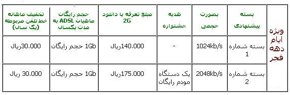 به گزارش سیتنا، در این دوره ارائهی خدمات اینترنت پرسرعت طی دو مرحله و در دو بسته پیشنهادی آماده واگذاری به کاربران می باشد. این بسته ها در ایام دهه فجر به شرح ذیل می باشد: