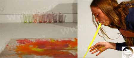 یک دختر ۲۷ ساله با استفاده از شیر سویا و رنگهای خوراکی و نوشیدن و سپسس بالا آوردن آنها نقاشی های منحصر به فردی خلق می کند.