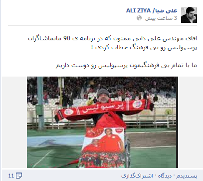 به گزارش سیتنا، این مجری پس از گفت و گوی علی دایی با برنامه شب گذشته نود دست به انتقاد از مربی پرسپولیس زد و روی صفحه فیسبوکش نوشت: «اقای مهندس علی دایی ممنون که در برنامه 90 ما تماشاگران پرسپولیس رو بیفرهنگ خطاب کردی! ما با تمام بیفرهنگیمون پرسپولیس رو دوست داریم.»