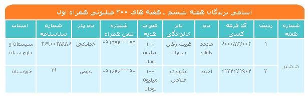 پس از قرعه کشی میان شماره های دایمی و اعتباری، آقایان محمد طاهر هیبت زهی سوران از استان سیستان و بلوچستان به شماره موبایل 85***091587 و احمد مکوندی غلامی از استان خوزستان به شماره موبایل 90***091676 به عنوان برندگان خوش شانس هفته ششم معرفی شدند.