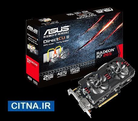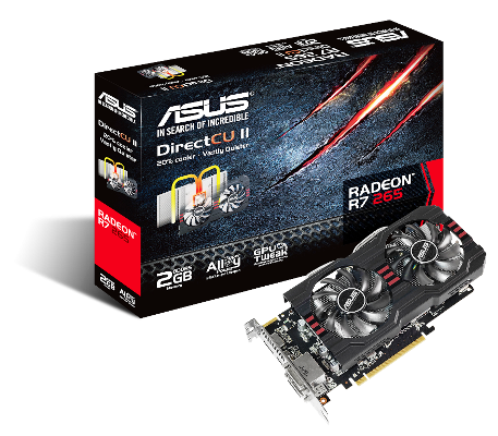ایسوس خبر از عرضه کارت گرافیکی R7 265 با همکاری AMD داده است. این کارت از فناوری انحصاری ایسوس با نام DirectCU II بهره می برد که نسبت به مدل مرجع این کارت 20 درصد خنک تر و سه برابر کم صدا تر می باشد و همچنین به علت بهره مندی از قطعات موسوم به Super Alloy Power از 2.5 برابر عمر بیشتر نیز برخوردار می باشد.