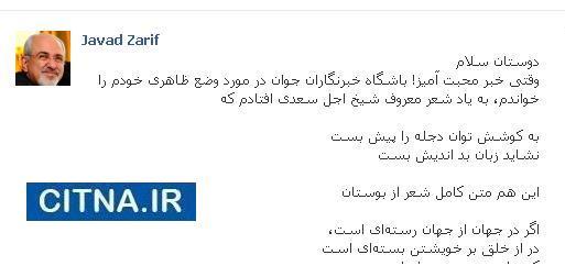 محمدجواد ظریف وزیر خارجه ایران در واکنش به خبر باشگاه خبرنگاران در مورد وضعیت ظاهری اش شعری از سعدی در فیس بوک منتشر کرد.