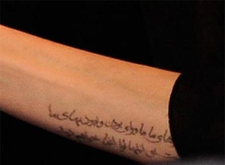 در یکی از تصاویر منتشر شده رسانه ها از این مراسم، خالکوبی دست راست آنجلینا جولی دیده می شود که جمله ای دو سطری به زبان فارسی است اما در این تصویر تنها سطر اول قابل خواندن است.