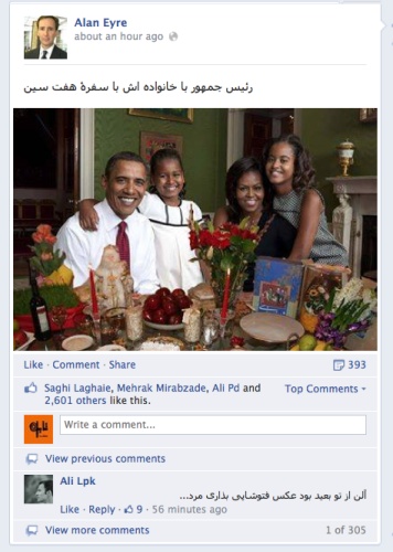 آلن ایر سخنگوی فارسیزبان وزارتخارجه آمریکا که با پستهای فیسبوکیاش به زبان فارسی حسابی در چند وقت اخیر مشهور شده است در آستانه تحویل سال با انتشار تصویری از اوباما و حانوادهاش در کنار سفره هفت سین عید را ایرانیها تبریک گفت.
