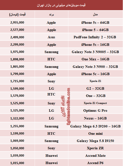 به گزارش خبرنگار اقتصاد آنلاین به نقل از بازار موبایل تهران، قیمت انواع موبایلهای بالاتر از یک میلیون تومان در بازار به شرح زیر است: