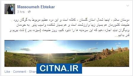 به گزارش سیتنا، معصومه ابتکار، معاون رئیس جمهور و رئیس سازمان محیط زیست در صفحه شخصی خود در شبکه اجتماعی فیس بوک نوشت: