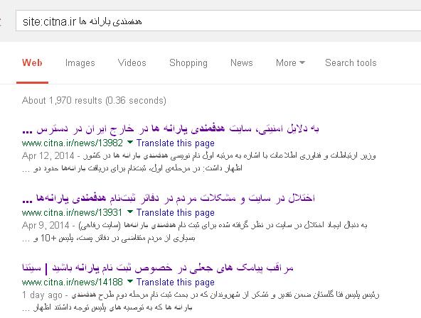 با کلید واژه «Site:» در فیلد جستجوی گوگل و سپس اضافه کردن سایت مورد نظر خود، میتوانید نتایج جستجو را منحصر به وبسایت مورد نظر کنید؛ برای نمونه، اگر نام «site:citna.ir» را به علاوه مثلا کلید واژه هدفمندی یارانهها جستجو کنید، نتایج جستجو تمامی موارد مربوط به این کلید واژه از وبسایت سیتنا خواهد بود.