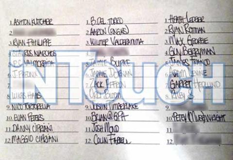 فهرستی ۳۶تایی که نام بازیگران مطرحی چون: یواخین فینیکس، جاستین تیمبرلیک ، زاک افرون، کالین فارل، هیث لجر، آدام لوین، اشتون کوچر، اورلاندو بلوم و جیمز فرانکو در آن به چشم میخورد. این دستنوشته ظاهرا توسط یکی از نزدیکان لوهان منتشر شده است.