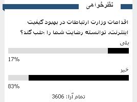 به گزارش سیتنا، در نظرسنجی اینترنتی پایگاه خبری سیتنا (CITNA.IR) که تا زمان ارسال این خبر بالغ بر 3600 نفر شرکت کردهاند، تنها حدود 17 درصد از شرکت کنندگان به سوال "اقدامات وزارت ارتباطات در بهبود کیفیت اینترنت، توانسته رضایت شما را جلب کند؟" پاسخ مثبت دادهاند و سایر شرکت کنندگان این اقدامات را کافی نمیدانند.