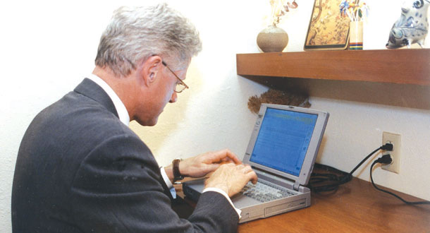 عکس زیر بیل کلینتون رئیس جمهور وقت آمریکا را در حال ارسال نخستین ایمیل از کاخ سفید واشنگتن در روز 7 نوامبر 1998 نشان می دهد.