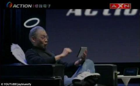 وی در این اگهی، به مانند جابز، شلوار جین لیوزایز و لباسی که یقه اش تا به گریبانش رسیده، پوشیده است. اما وجه جالب این اگهی این است که جابز تایوانی، یک هاله نور و بال فرشته دارد. این استیو جابز تایوانی به شکلی بر روی صحنه قدم بر می دارد که دقیقا مدیرعامل فقید اپل قدم برمی داشت.