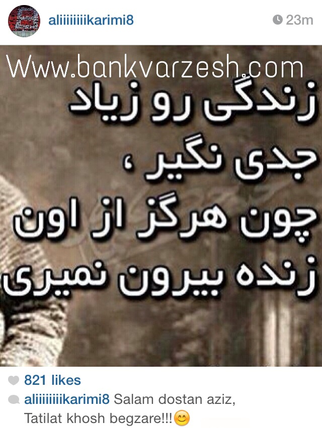 سیتنا - علی کریمی که جای خالیاش در تیم ملی حسابی توی ذوق میزند، این عکسنوشته را در اینستاگرامش منتشر کرده است. شاید اگر کریمی میدانست هوادارانش چقدر از دست بیخیالیهای او حرص میخورند، کمی بیش از اینها لااقل زندگی ورزشیاش را جدی میگرفت.