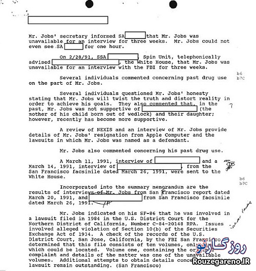 به گزارش سیتنا به نقل از روزگار نو، این پروندهی 191 صفحهای توسط "اف بی ای" و در جریان بررسی اعطای پستی مهم در کاخ سفید در سال 1991 تهیه شده است؛ چراکه جرج بوش در سال 91 به دنبال انتخاب جابز به عنوان رئیس شورای صادرات بود.