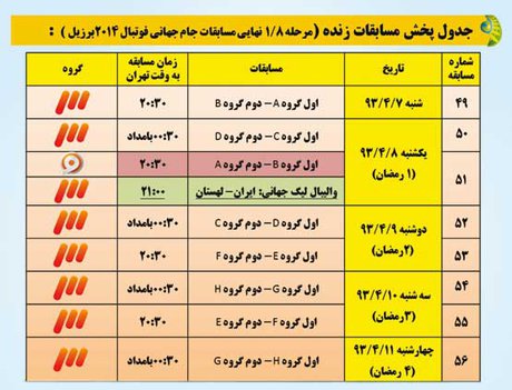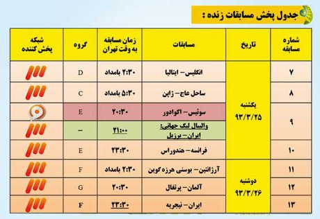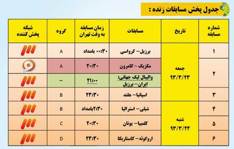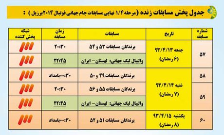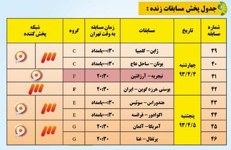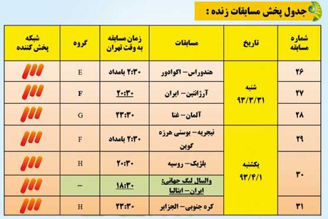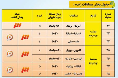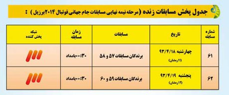 جداول پخش بازیهای جام جهانی فوتبال از تلویزیون به این شرح است: