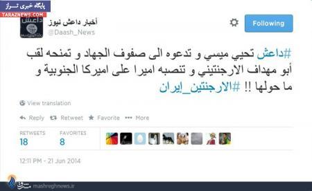 به گزارش سیتنا، گروه تروریستی داعش در شبکه ی اجتماعی خود برد آرژانتین مقابل ایران را به مسی تبریک گفت و او را به جهاد دعوت کرد.