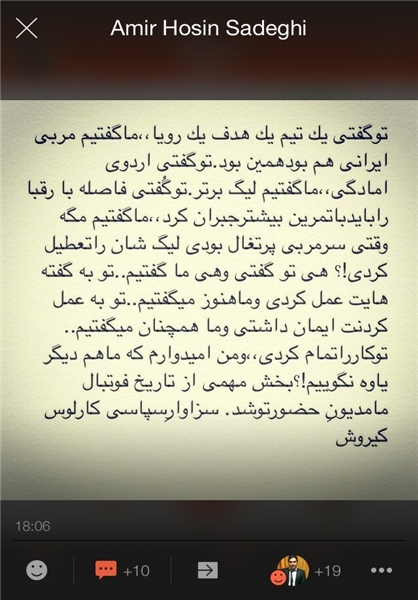 وی در ادامه آورده است: هی تو گفتی و هی ما گفتیم، تو به گفتههایت عمل کردی و ما هنوز میگفتیم ... تو به عمل کردنت ایمان داشتی و ما همچنان میگفتیم ... تو کار را تمام کردی و من امیدوارم که ما هم دیگر یاوه نگوییم!؟ بخش مهمی از تاریخ فوتبال ما مدیون حضور تو شد. سزاوار سپاسی کارلوس کیروش