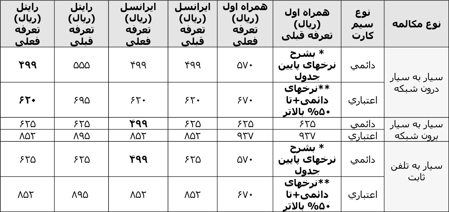 جدول مقایسهای تعرفه اپراتورهای تلفنهمراه به شرح زیر میباشد: