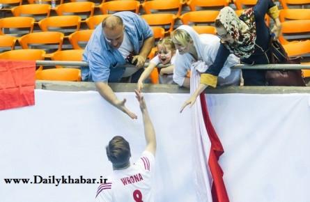 تلاش یک خانم برای دست دادن با بازیکن والیبال در بازی ایران-لهستان +تصویر