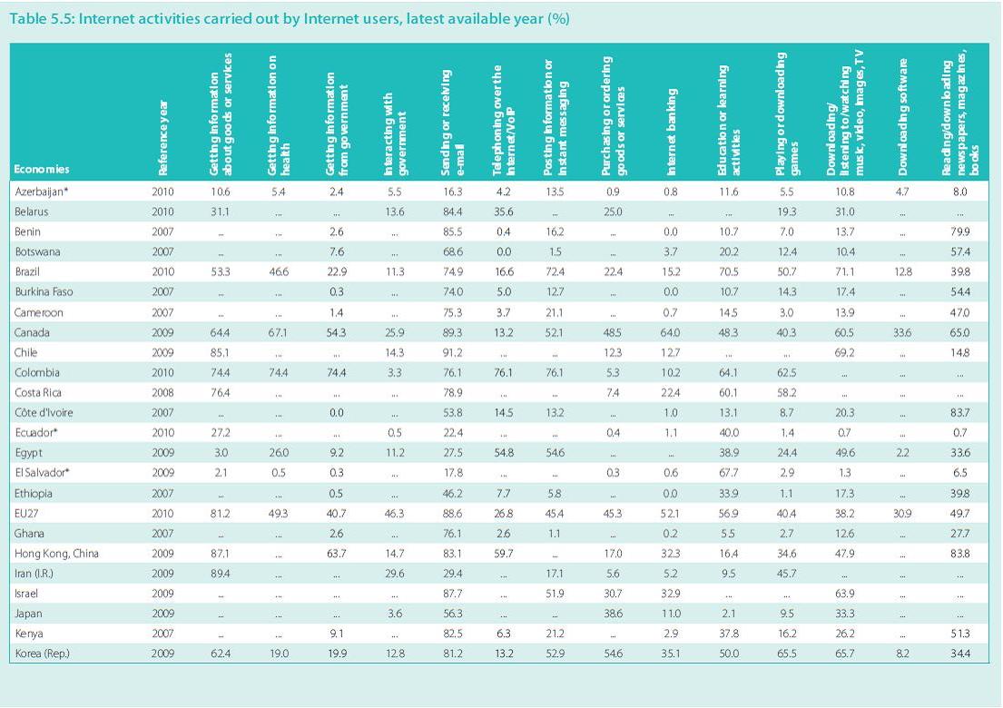 دادههای حاصل از اقتصادهای توسعهیافته و درحالتوسعه نشان میدهد که ارتباطات اینترنتی همچنان متداولترین فعالیت کاربران اینترنتی در بسیاری از کشورهاست و سایر فعالیتها مانند دولت الکترونیک، بانکداری الکترونیک و مبادلات تجاری، رواج کمتری دارند.
