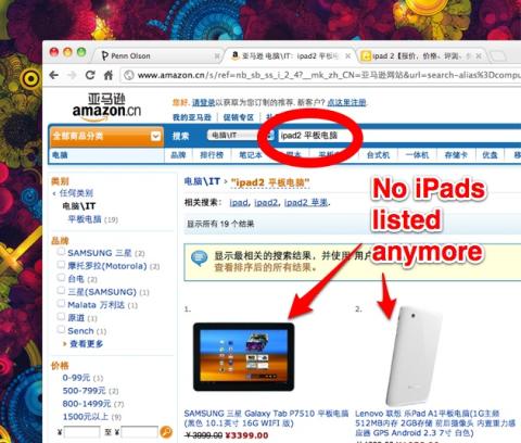 شرکت اپل از سایت آمازون خواست تا اجازهی فروش آنلاین تبلتهای آی پد 2 را که به وسیلهی دلالان چینی در سایتهای چینی آمازون فروخته میشود را ندهد.