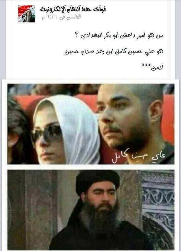 کاربران شبکه های اجتماعی فیس بوک و توییتر روز دوشنبه با انتشار عکسی از ابوبکر البغدادی رئیس ادعایی گروه تروریستی داعش و علی حسین کامل فرزند رغد دختر صدام حسین نوشتند که بغدادی در واقع همان علی حسین کامل نوه دختری صدام حسین است و نه هیچکس دیگر!