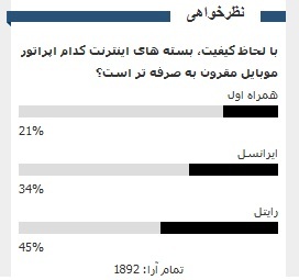 در نظرسنجی اینترنتی پایگاه خبری سیتنا (CITNA.IR) که تا زمان ارسال این خبر بالغ بر 1890 نفر شرکت کردهاند، شرکت کنندگان به سوال "با لحاظ کیفیت، بسته های اینترنت کدام اپراتور موبایل مقرون به صرفه تر است؟" پاسخ دادهاند و 45 درصد از آنان سرویس اینترنت رایتل، 34 درصد سرویس اینترنت ایرانسل و 21 درصد سرویس اینترنت همراه اول را مقرون به صرفهتر دانستهاند.