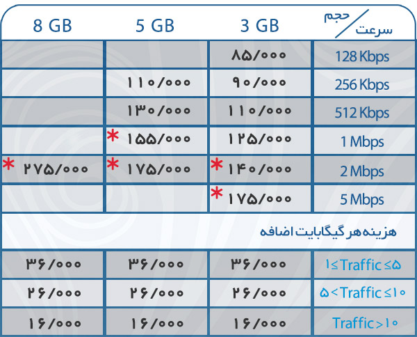 *فقط برای مشترکانی که سرویس های مشخص شده با ستاره در جدول تعرفه ها را با قرارداد یکساله انتخاب و خریداری مینمایند.