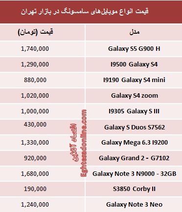 جدیدترین قیمت موبایلهای محبوب سامسونگ مطابق جدول ذیل است: