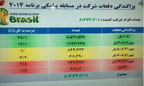عادل فردوسی پور در آخرین شب از برنامه ویژه جام جهانی که خودش تهیه کنندگی آن را بر عهده داشت ، آماری از شرکت کنندگان در نظرسنجی برنامه اش ارائه داد که می توان با سه نسبت کمترین ، میانگین و بیشترین ، رقم درآمد صدا و سیما از پیامک های برنامه عادل فردوسی پور را در آورد.