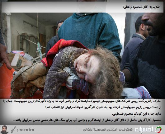 در پایان از آنجاکه احساس میشود بخشی از هولوکاست نوین صهیونیستها، محصول کارآفرینی حاصل از عضویت یا دفاع شما از برندهای ضداجتماعیِ فیسبوک، اینستاگرام و واتساپ، برای سگهای هارِ نحسِ نجسِ اسراییلی باشد؛ با افسوس و چشمان اشکبار، تصاویر زیر را خدمتتان تقدیم میکنم: