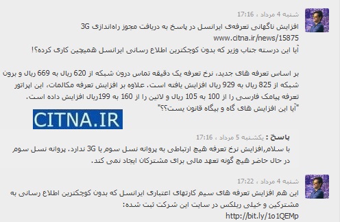 وزیر ارتباطات و فناوری اطلاعات در پاسخ به کامنت گلایه آمیز یکی از کاربران شبکهی اجتماعی کلوب در ذیل تیتر خبر سیتنا تحت عنوان "افزایش ناگهانی تعرفهی ایرانسل در پاسخ به دریافت مجوز راهاندازی 3G"، نوشته است: "پروانه نسل سوم در حال حاضر هیچ گونه تعهد مالی برای مشترکان ایجاد نمی کند".