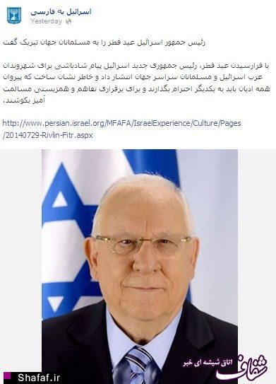 به گزارش سیتنا به نقل از شفاف، پیام تبریک رئیس جمهور جدید اسرائیل به مسلمانان به مناسبت فرارسیدن عید فطر در صفحه رسمی فارسی زبان وزارت خارجه اسرائیل در فیس بوک منتشر شد.