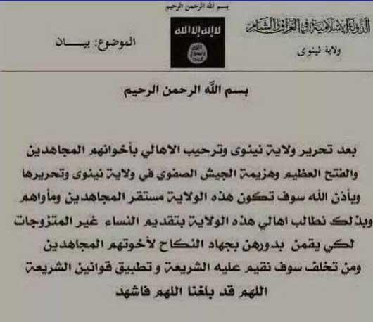 اما گروه تروریستی داعش به این هم بسنده نکرده و در ادامه اقدامات کثیف خود اعلام کرده که اقلیت های مذهبی عراق را به عنوان دارایی خود محسوب کرده و با قتل عام همسران این افراد، زنان آنها را به اسارت گرفته است.