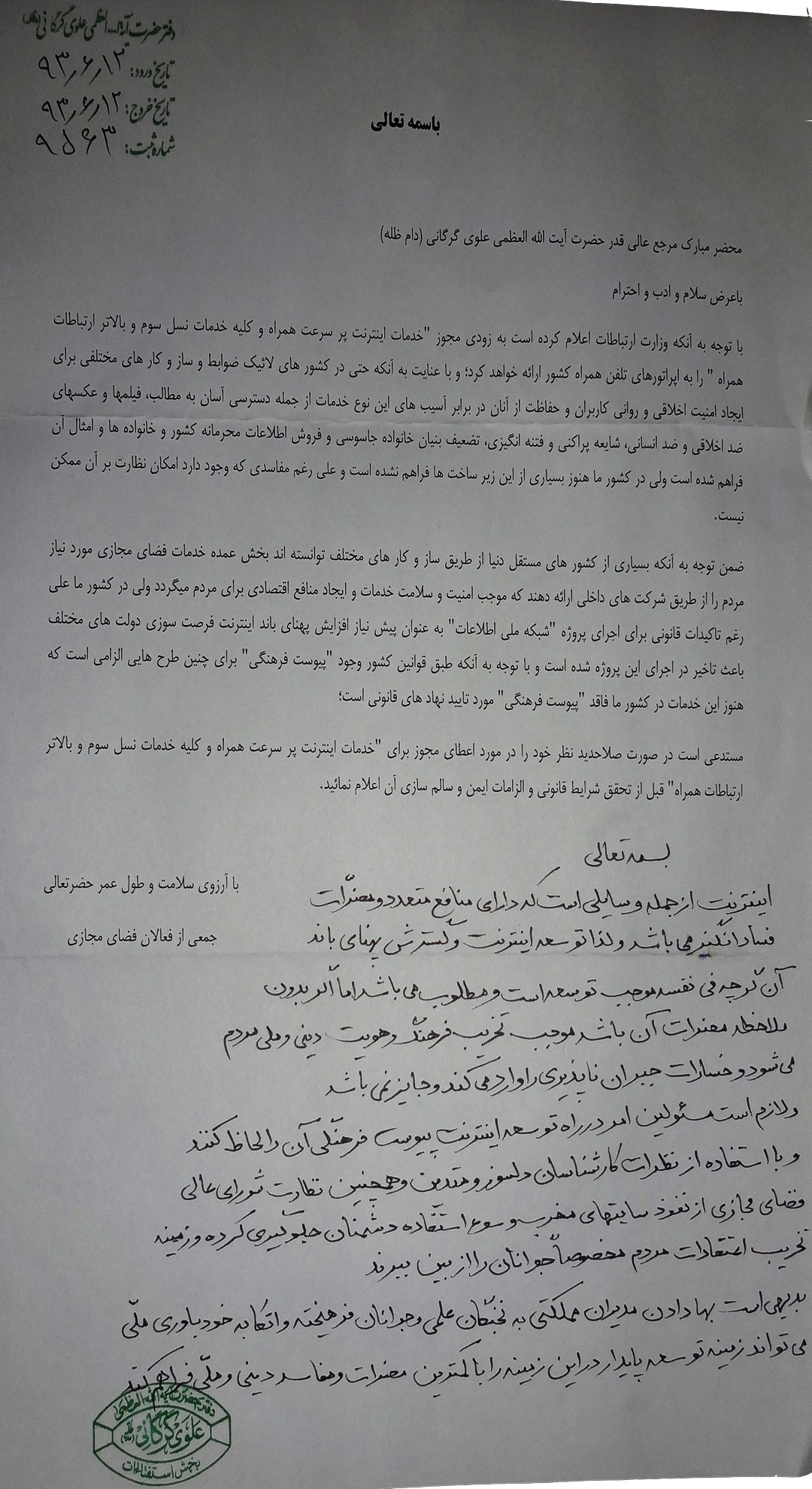 آیت الله العظمی علوی گرگانی در استفتائی پیرامون ارائه مجوز "خدمات اینترنت پرسرعت همراه و کلیه خدمات نسل سوم و بالاتر ارتباطات همراه" بدون «پیوست فرهنگی»، فرمودند: "لازم است مسئولین امر در راه توسعه اینترنت، پیوست فرهنگی آن را لحاظ کنند و با استفاده از نظرات کارشناسان دلسوز و متدین و همچنین نظارت شورای عالی فضایمجازی از نفوذ سایتهای مخرب و سوءاستفاده دشمنان جلوگیری کرده و زمینه تخریب اعتقادات مردم، مخصوصاً جوانان را از بین ببرند".