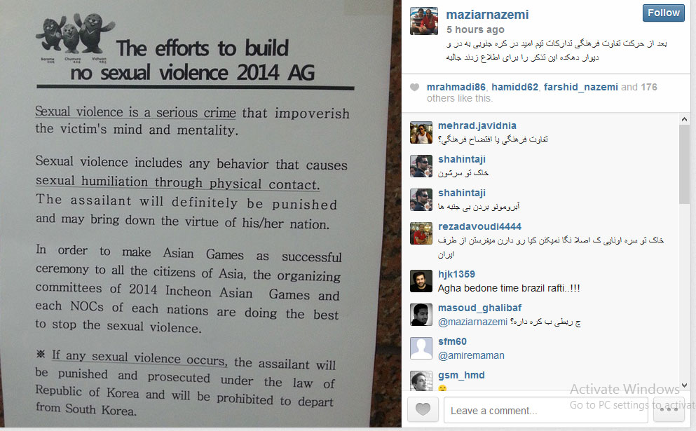 مازیار ناظمی، از مدیران کل وزارت ورزش، در اینستاگرام خود، تصویری از یک اطلاعیه در دهکده بازیهای آسیایی اینچئون در خصوص تعرض جنسی را منتشر کرد.