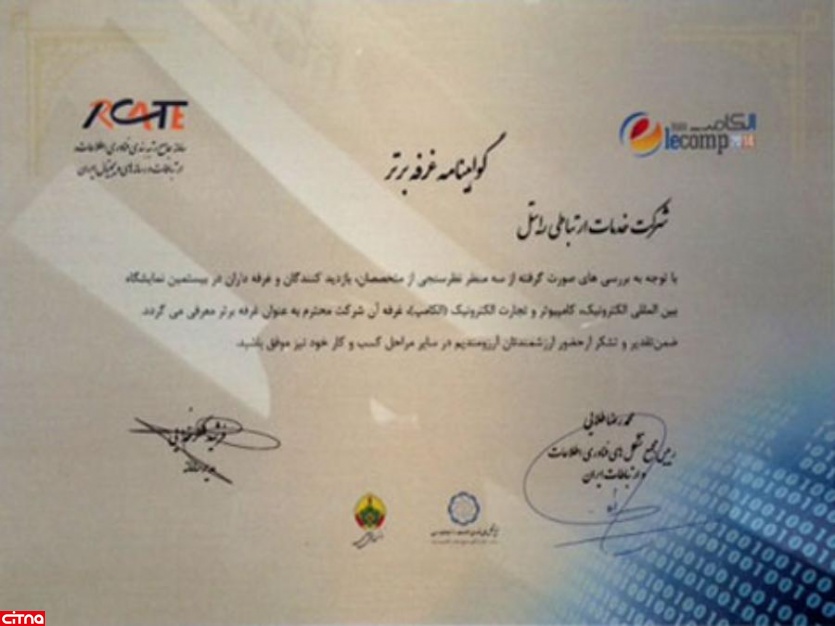در این لوح آمده است: "با توجه به بررسی های صورت گرفته از سه منظر نظرسنجی از متخصصان، بازدیدکنندگان و غرفه داران در بیستمین نمایشگاه بین المللی الکترونیک، کامپیوتر و تجارت الکترونیک، غرفه آن شرکت محترم به عنوان غرفه برتر معرفی می گردد. ضمن تقدیر و تشکر از حضور ارزشمندتان آرزومندیم در سایر مراحل کسب و کار موفق باشید. "