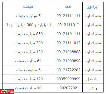 به عنوان مثال برای خط دائمی 09121111012 قیمتهای اعلامی از سوی دلالان با یکدیگر 30 تا 40 میلیون تومانی تفاوت داشت. قیمت این خط چیزی بین 250 تا 300 میلیون تومان است.در بازار آزاد، خطوط رند از یک تا 2 میلیون تومان شروع شده و باورکردنی نیست که به میلیاردها تومان هم کشیده میشود.