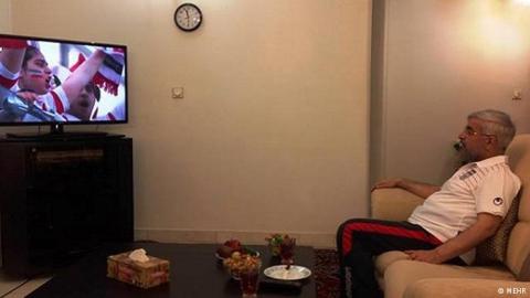 حسن روحانی، رئیسجمهوری اسلامی، در حال تماشای بازی تیم ملی فوتبال ایران در جام جهانی برزیل. این عکس "بیروح" توصیف و از اینکه روحانی به تنهایی فوتبال تماشا میکند، انتقاد شده است.