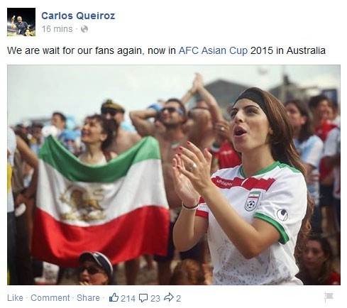 کارلوس کیروش، سرمربی پرتغالی تیم ملی فوتبال کشورمان با گذاشتن عکس زیر در صفحه شخصی فیسبوکش از همه ایرانیان خواست که تیم ملی را در راه جام ملت های آسیا حمایت کنند.