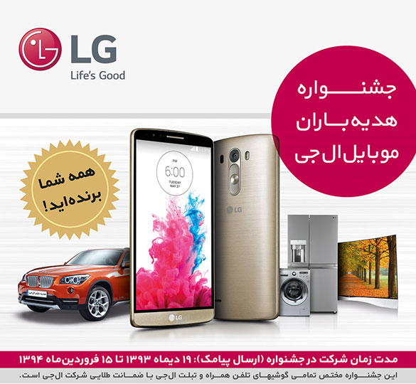 قرعه‌کشی بزرگ موبایل ال‌جی شامل ۲ دستگاه خودروی BMW سری X1 می‌شود که بین تمامی خریداران محصولات موبایلی ال‌جی در ۲۰ فروردین ماه در دفتر ال‌جی در تهران برگزار می‌شود.