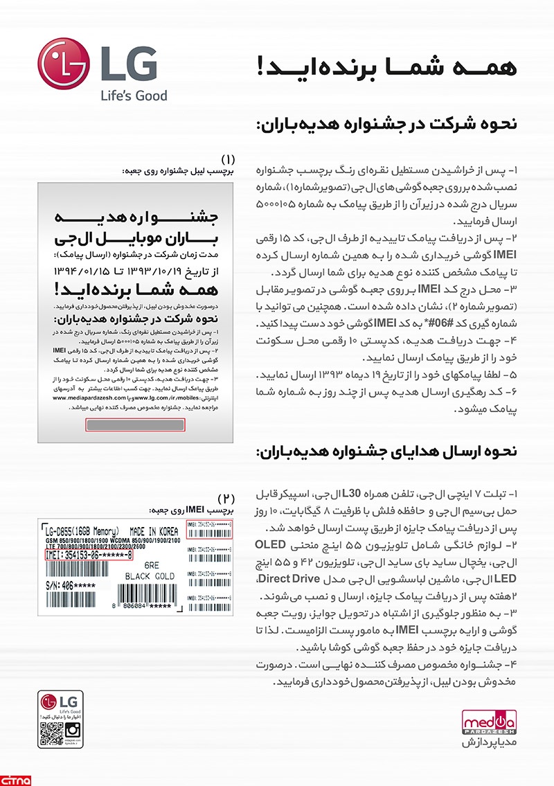 بعد از خراشیدن مستطیل نقره‌ای‌رنگ برچسب جشنواره نصب‌شده بر روی جعبه گوشی‌های ال‌جی (تصویر شماره ۱) شماره سریال درج‌شده در زیر آن را از طریق پیامک به شماره ۵۰۰۰۱۰۵ ارسال کنید. در صورت مخدوش بودن برچسب، از پذیرفتن محصول صرف نظر کنید.