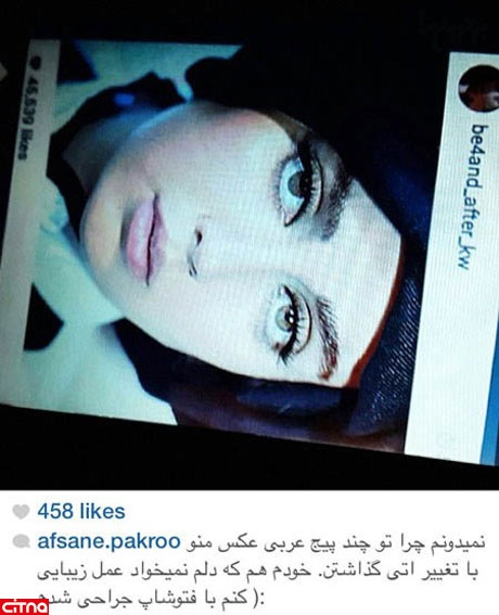 "افسانه پاکرو" با اشتراک گذاری این عکس نوشت: نمیدونم چرا تو چند تا پیج عربی عکس منو با تغییراتی گذاشتن.خودم هم که دلم نمیخواد عمل زیبایی با فتوشاپ جراحی شدم ! :(